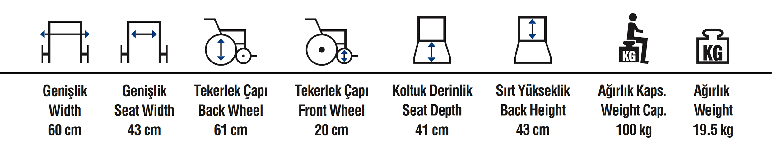 • Kromajlı çelik şase • Ayak çıkarılabilir • Kollar kalkar • 200x50mm PU ön teker • 24" dolgu arka teker • Alüminyum jant • Alüminyum pedal • Naylon kumaş • Emniyet kemeri